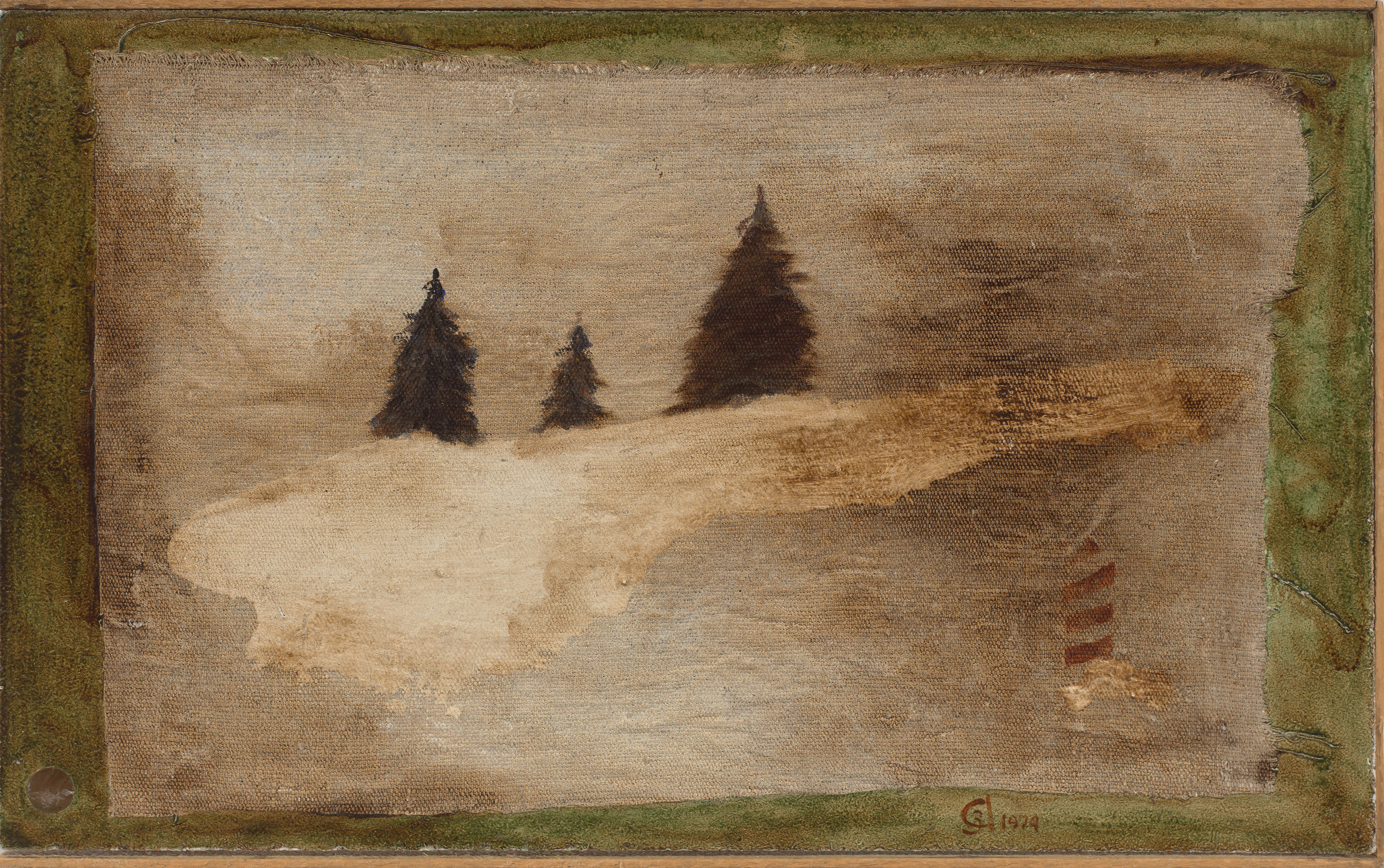 primed canvas, particleboard, oil