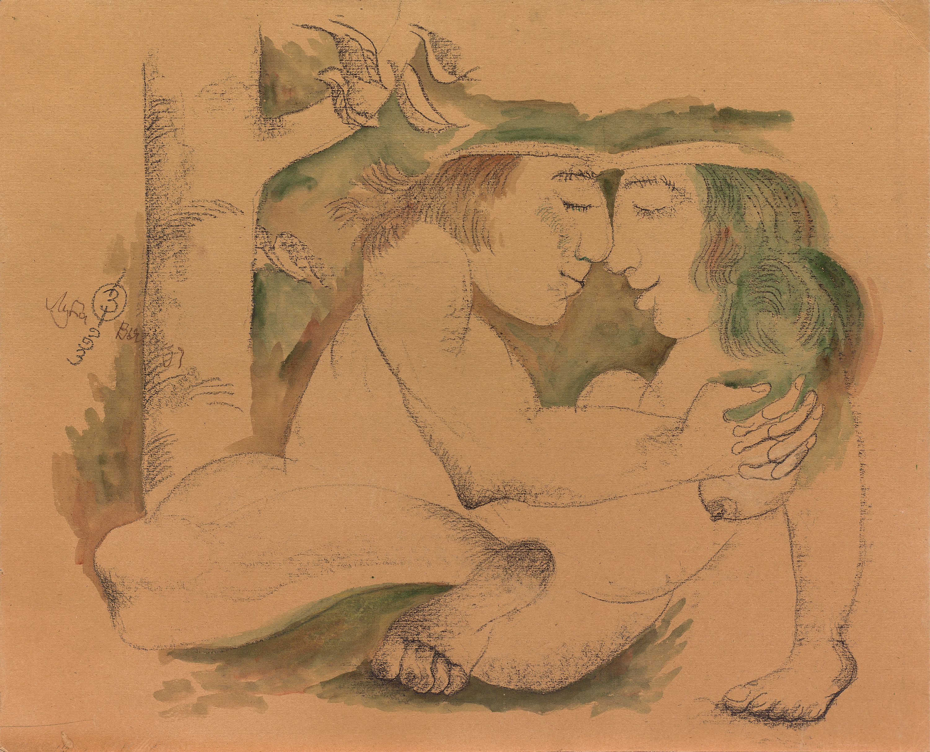 primed cardboard, coal, watercolor